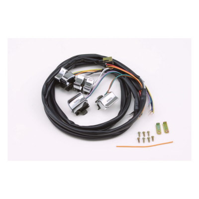Täydellinen ( vasen ja oikea puoli ) sähkökytkin sarja missä on myös täysin oikean väriset ( samat kuin tehtaan alkuperäiset värit ) johdot pituudeltaan 48" ( 8" pidempi kuin alunperin ). Sopii kaikkiin Big Twineihin ja Sportstereihin 1982 - 1995 (poislukien tehtaan radiolla varustetut mallit). Tässä sarjassa on kromatut kytkimet mustallalla tekstillä. Huom. kotelot eivät sisälly sarjaan.
