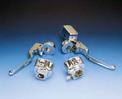 Hallintalaitesarja ilman johtoja ja ilman katkaisijoita. Sopii pyöriin joissa käytetään tupla levyjarrua edessä. Jarrusylinterin poraus on 3/4" (0,750 "). Käytetty vuosina 1982-1983. Tietenkin kromattu. Keinu-ja tööttikytkimet löytyvät Sähköosat-osastosta.