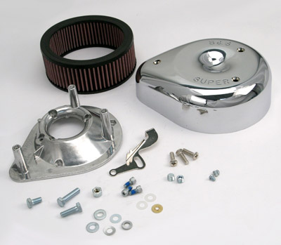 Alkuperäinen S&S ilmanputsariasetelma Super E/ G- kaasuttimeen. Tämä sopii Big Twin-malleihin 1966-84 ja Sportster -mallit 1957-85. Sarja sisältää kannen, pohjan, kiinnitysruuvit, suodattimen sekä ryyppyvivut. Huom. pitää hioa kantta jos käytät 5 gal. tankkeja.